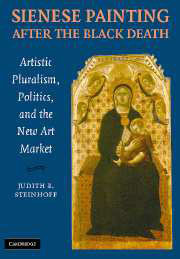Steinhoff’s book is among the most thorough responses to Meiss’s Black Death theory as it applies to Sienese painting. While two aspects of her argument are well known—that the plague disrupted patronage and workshop practice appears in van Os, and that the style combines aspects of tradition and innovation can be found in several studies and summarized in Diana Norman’s Siena, Florence and Padua: Art, Society and Religion, 1280–1400 (vol. 1, New Haven: Yale University Press, 1995, 177–195)—her analysis of them and their role in shaping what she describes as artistic plurality is new. Steinhoff’s close inspection of individual panels and penetrating analysis of the issues related to style is impressive. In particular, Steinhoff’s analysis of the works of Bulgarini and the circle of artists within the “compagnia” deepens our understanding of this important post-plague group.