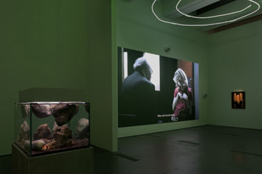 Huyghe’s practice may belong to the broad category called relational aesthetics, but it is not exactly participatory, for the humans and animals he employs are treated as characters, charged with fleshing out the contours of his adapted and invented scenarios. The Host and the Cloud, for example, documents a series of events in which Huyghe set loose a group of women and men in an abandoned ethnological museum to enact and improvise upon roughly scripted situations abstractly derived from the rituals of May Day, Valentine’s Day, and Halloween. The film documents eerily cultic versions of a trial, coronation, hypnosis session, and sexual orgy, and it is unclear where Huyghe’s directions stop and the characters’ improvisation begins. Because of the exhibition design’s deliberate nod to Mike Kelley and its taking place in Los Angeles, one could not help but compare Huyghe’s associative way of exploring cultural ritual, which works to extend the logics of shared rites, with the work of Kelley, whose work is openly critical and satirical of much of the same cultural material. Finally, the exhibition was a reminder that Huyghe’s deeply complex, project-based work remains tricky material for contemporary art historians, who may either borrow the artist’s own allusive, yet frustratingly tautological language for explaining the work and its choices (a common path), or risk deflating the by-now-mythic stature (for the most part deserved, I think) that surrounds the artist and his practice.