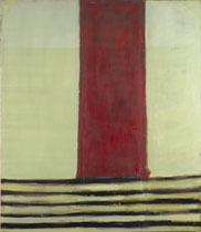 The conception of this show has a couple of major implications. First, Stella, despite his youth and relative naïveté, knew what he was doing, and thus his black paintings were not a chance discovery but were the product of a yearlong investigation into formal problems raised by second generation Abstract Expressionists and the techniques of Jasper Johns. Secondly, the link to Johns, who brought home the image/object paradox like no other before him, implicitly suggests a potential reconstruction of the origins of Stella’s art, and more broadly, the origins of Minimalism. Indeed, the Johns connection is telling, and certainly some of Stella’s paintings have it. Stella, who was aware of Johns since his student days, became engaged with Johns’s repetitive method of painting horizontal stripes. These spanning bands inspired by Johns’s series of Flags show up in a number of Stella works, such as Great Jones Street, with its alternating red and black stripes. In all of these horizontally oriented compositions, which include East Broadway and West Broadway among others, a solid rectangle hovers around the center of the pictorial field and interrupts the left to right procession of stripes. Perhaps it is a continued reference to Johns, where Stella’s monochromatic sections stand in for the missing stars. However, in some of the earliest works, Stella also seems to embrace the combine aesthetic of Johns. Assemblages like Them Apples and its pair, Untitled, display once again horizontal bands in combination with another solid field. But this time they are painted on cardboard and wood, while being hemmed in by a frame that makes this vertically oriented piece closer in spirit to Robert Rauschenberg’s Bed (1955) than to most of Johns’s work from this time.